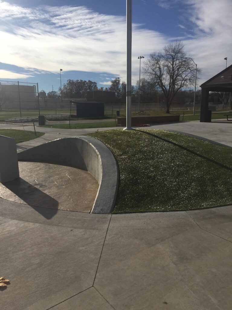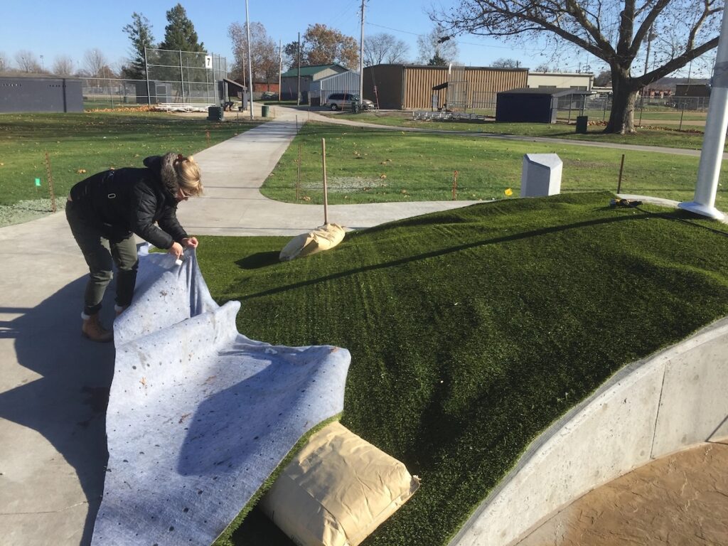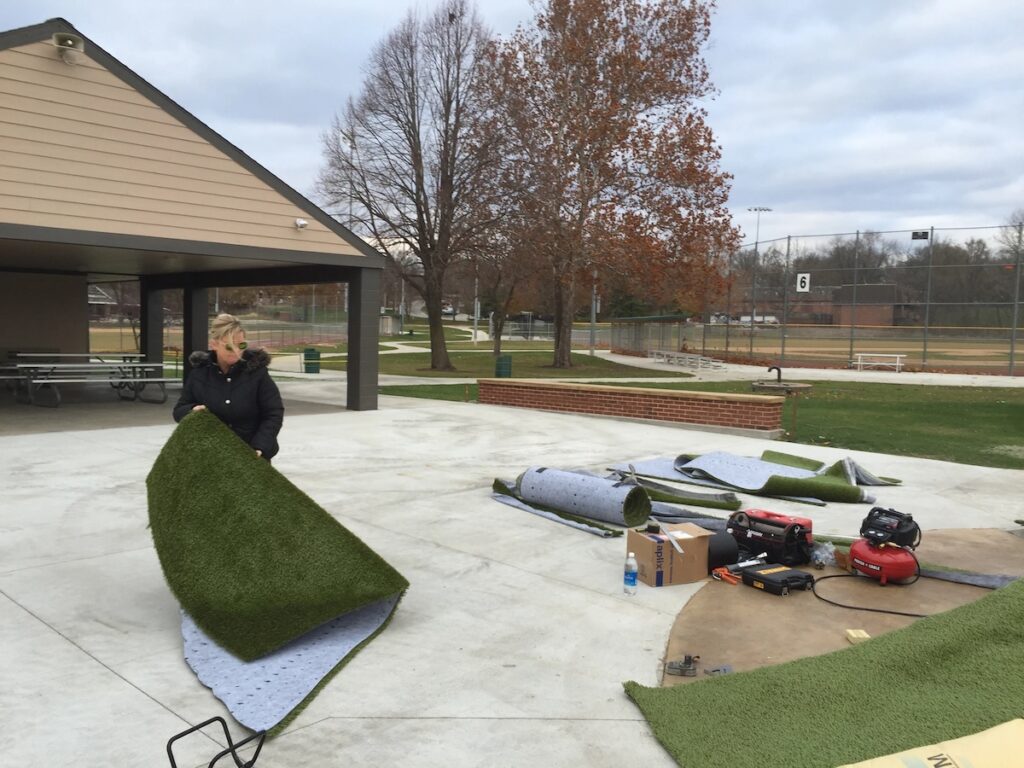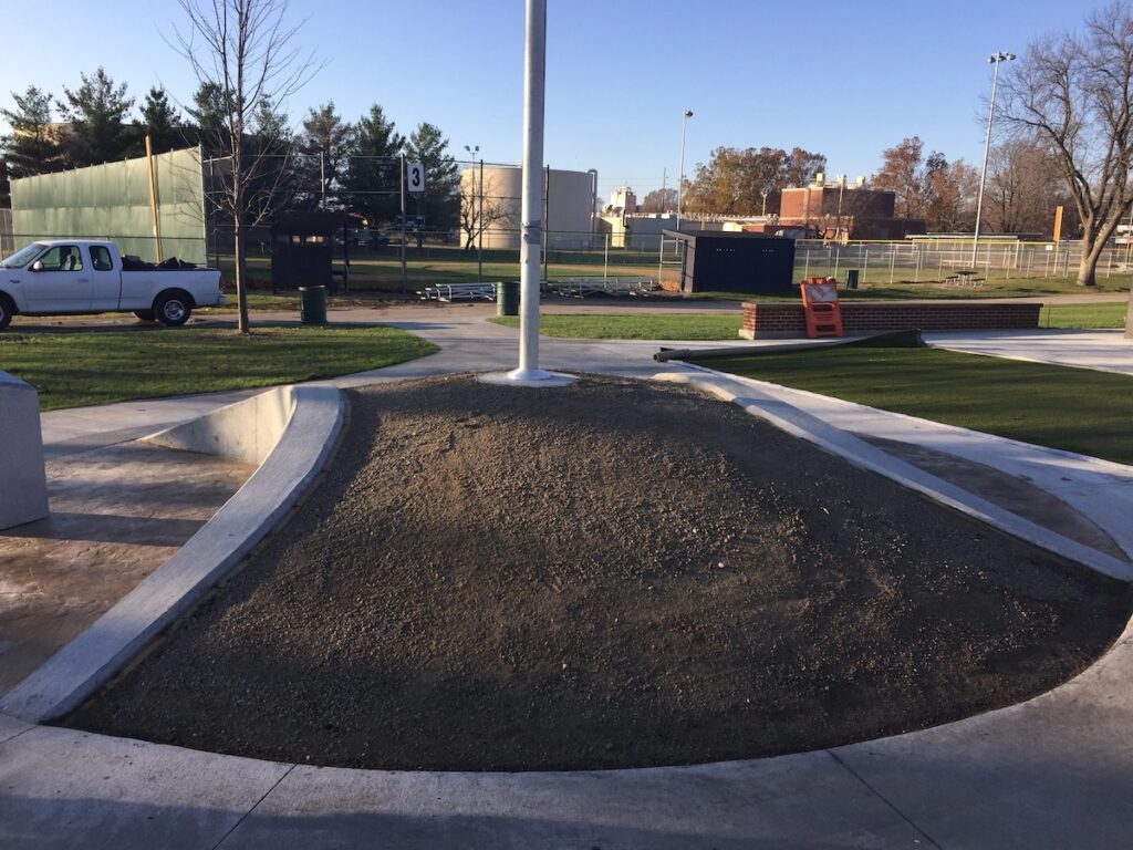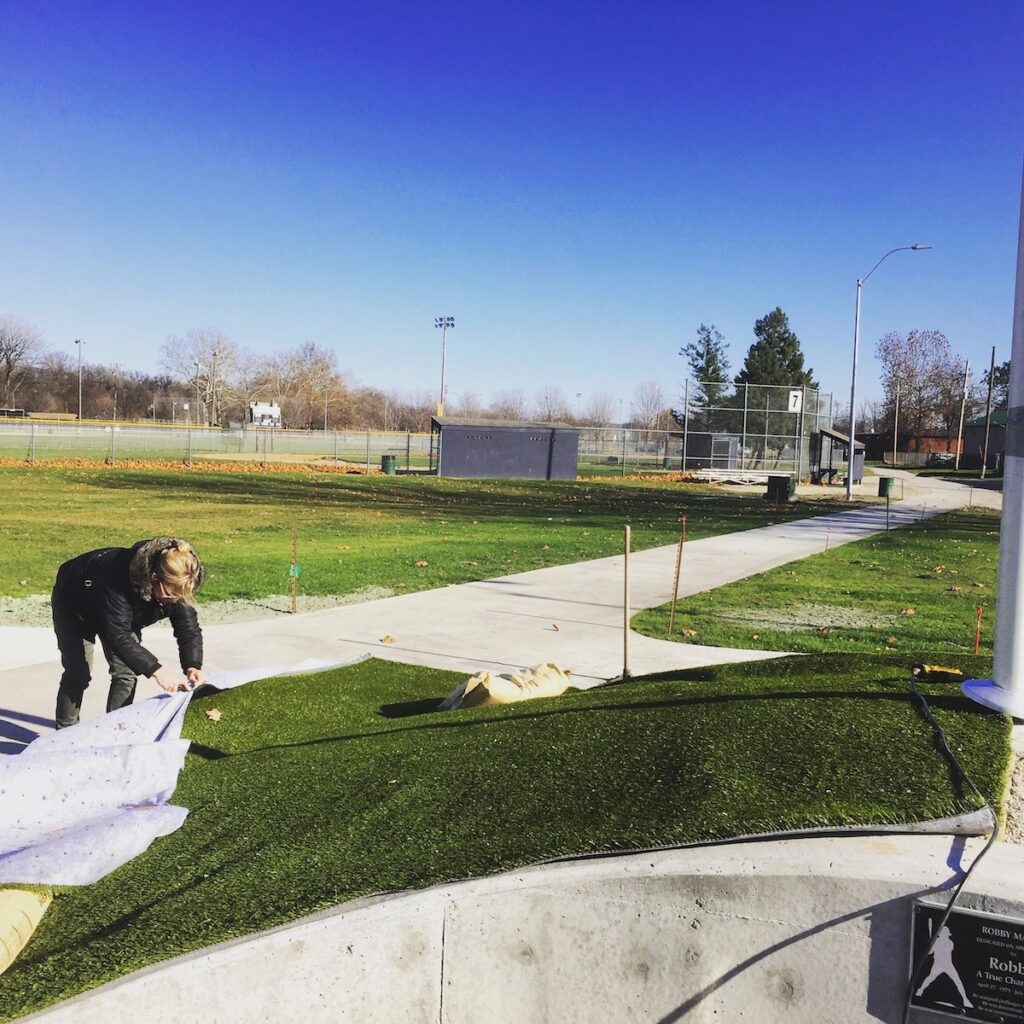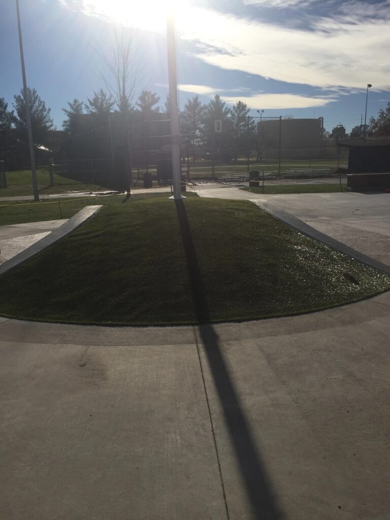 The entire space is in the shape of a baseball. We laid artificial turf to cover the center of the baseball, curving along the edges as the seam in a baseball. We trimmed to accommodate the flag pole in the center of the area.