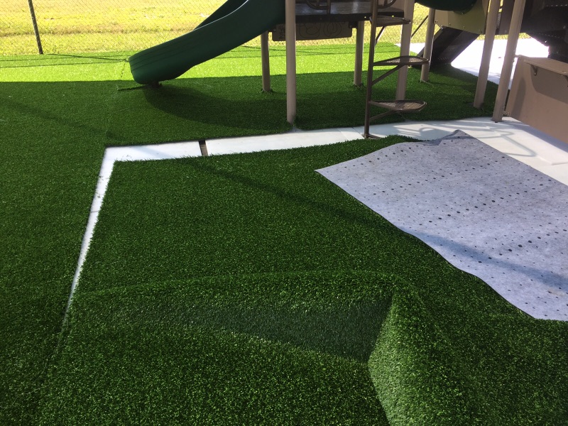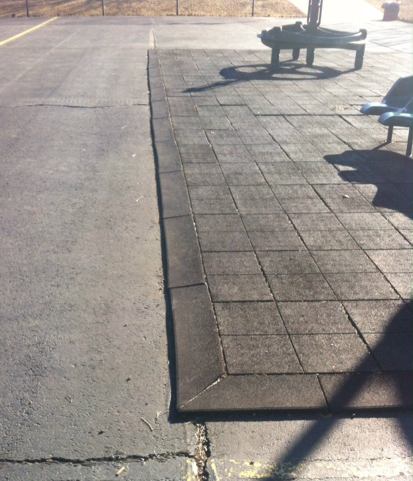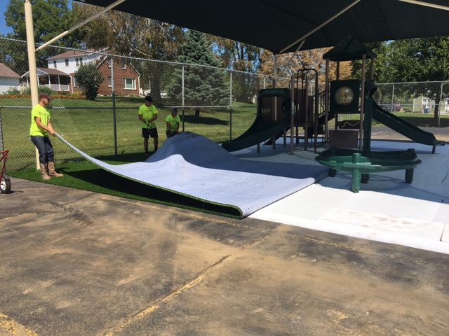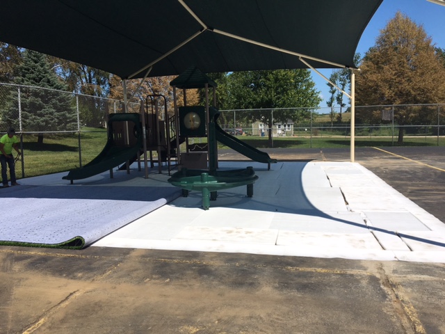The before pictures show a worn-out rubber tile surface that is uneven and no longer compliant. The school removed these tiles and ForeverLawn Des Moines added the fall attenuation pad and ADA compliant transition pad over the asphalt along with Playground Grass Extreme.
